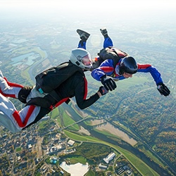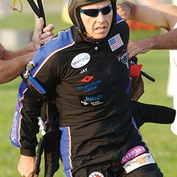 Double amputee Harry Shaw makes a tandem skydive with Stokes over Skydive Spaceland Houston in Rosharon, Texas, in 2010. Photo by Alex O'Connor.