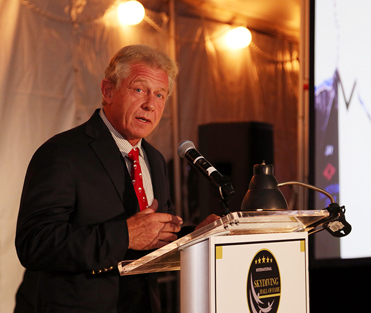 Stokes gives a speech as he is inducted into the International Skydiving Hall of Fame in 2018. Photo by Andrey Veselov.