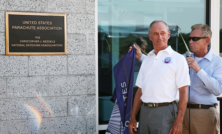 As USPA President in 2016, Stokes unveils a plaque naming the USPA Headquarters building after Executive Director Emeritus Chris Needels. Photo by Randy Connell.