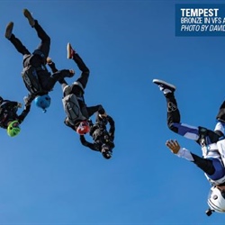 Out of the four teams competing, Skydive Elsinore swept the podium in 4-way rotations. Elsinore Too Wrapped Up, Elsinore Revolution and Elsinore Team Safety Brief took gold, silver and bronze with a 16.5-, 9.25- and 6.25-point average, respectively. Too Wrapped Up and Revolution earned the right to represent the U.S. at the World Championships.