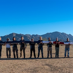 On December 7, after just one less-than-successful rehearsal jump with a smaller, similar apparatus, the team boarded Skydive Arizona’s Huey for the short flight to their own Area 51 with the actual flag. As the helicopter climbed to 10,000 feet and prepared for the jump run, expressions of concerned confidence transformed into focused determination. This determination extended not only to the four skydivers holding the flag but also to Jack Lane, who captured the moment on camera while under canopy, and Joe Jennings, who filmed in freefall using his oversized wings. Additional participants joining the jump—Sean Gustafson, Isaacman and Tim Sheehy (who is a Montana State Senator)—took their positions to exit from the port side door. Timing and focus were critical for the entire team.