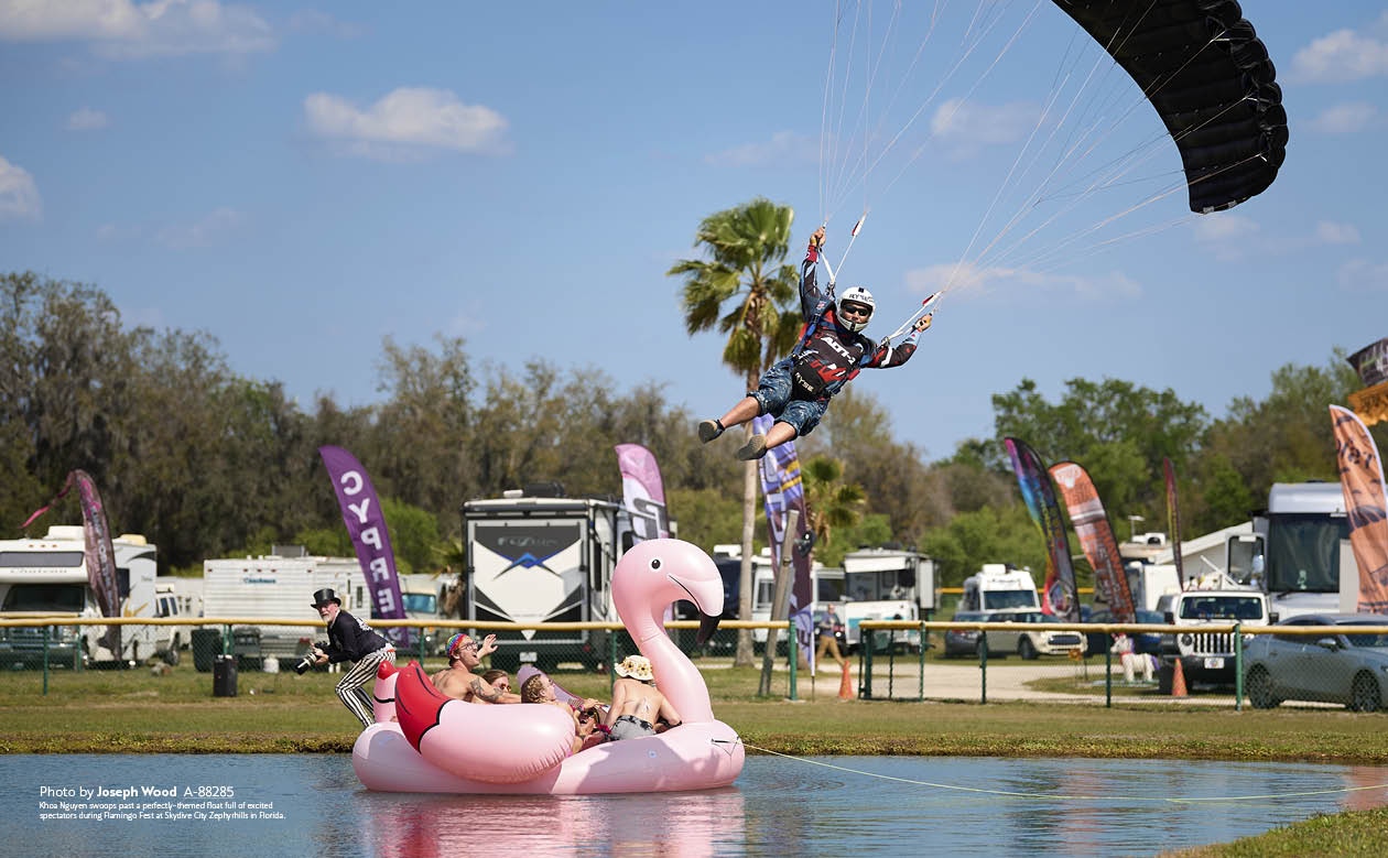 Khoa Nguyen swoops past a perfectly-themed float full of excited spectators during Flamingo Fest at Skydive City Zephyrhills in Florida.
