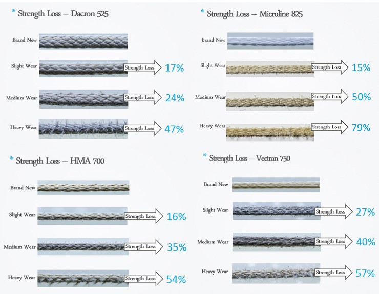 These four photos show stages of wear and strength loss in the different line types. Courtesy of Performance Designs.