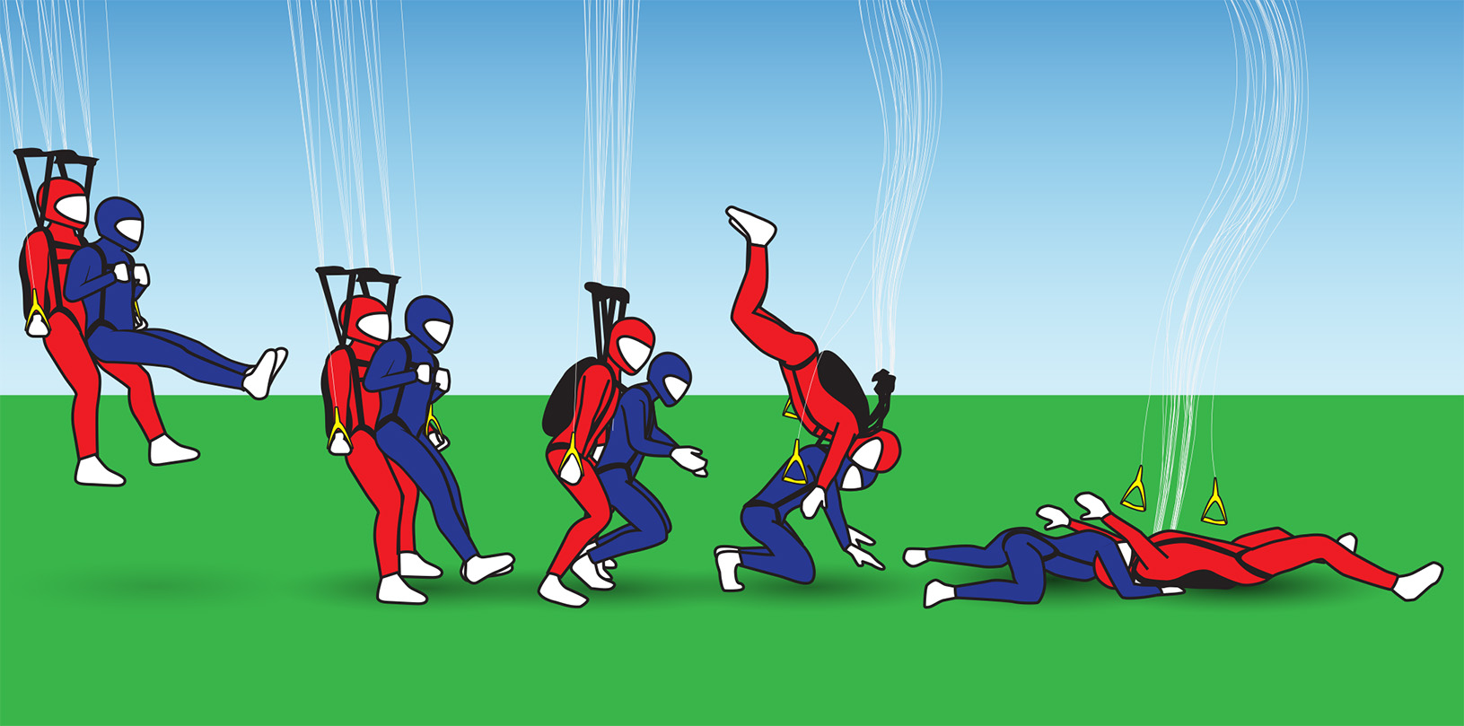 Even a seemingly routine landing can turn into a forward tumble when the student’s leg catches on the ground. When the lower laterals are unsecured, this can force the instructor’s and student’s heads and necks together, causing serious head, neck and spinal injuries. This is known as the “hinge effect,” in which the upper attachment points act as a fulcrum when the instructor’s body rotates over the student’s. In several cases, this has led to the instructor or student sustaining paraplegia or quadriplegia. From the 2024 USPA incident reports alone, four involved unsecured lowers: Two students sustained spinal cord injuries—one resulting in paraplegia—and two instructors suffered broken legs due to impact forces amplified by unconnected harness systems.