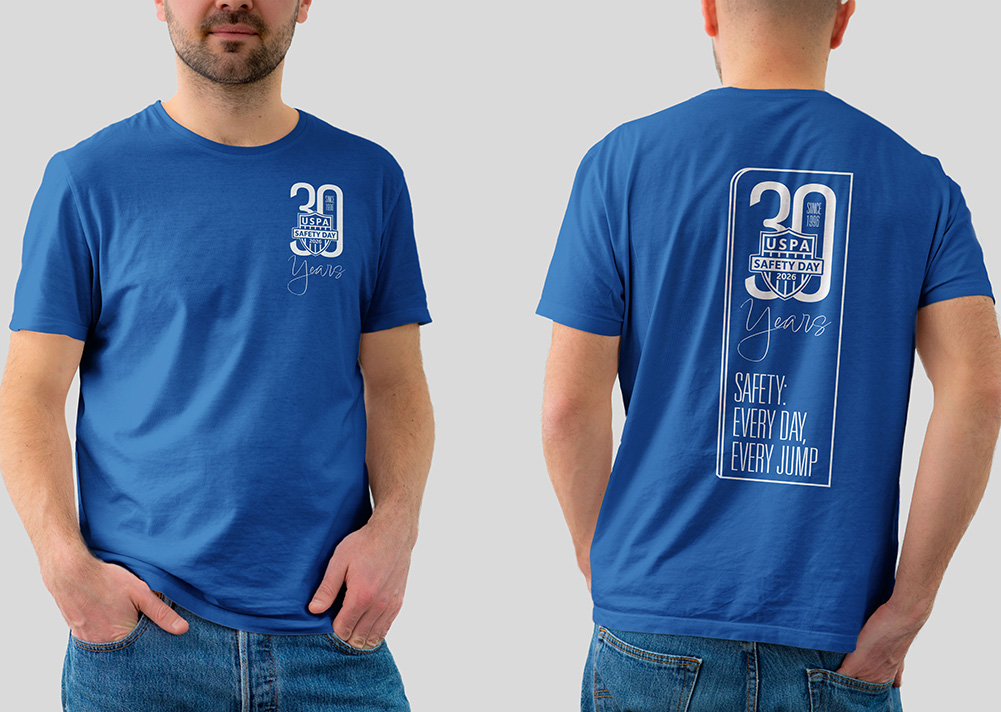 You can order newly redesigned T-shirts—this year in blue with a white graphic—from US Logo for just $7 each (add $2 for XXL; $3 for XXXL) plus shipping. You can order as few or as many shirts as you would like. For orders of 12 or more shirts, drop zones can add their logos to the sleeves at $1.75 more per shirt. Many drop zones order the shirts in bulk as gifts for their local jumpers. US Logo must receive your order no later than February 12 for events held on March 14 or at least three weeks in advance of your alternate event date. Contact Evan Nichols at evan@uslogo.net or call (316) 264-1321 to place your order.