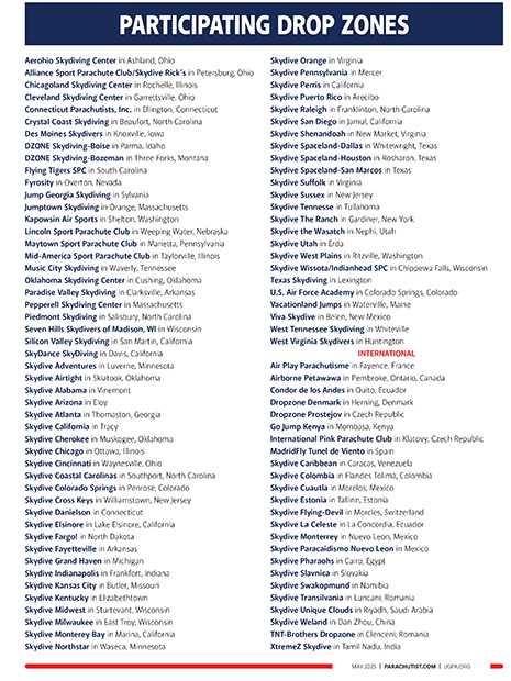A list of all participating drop zones, photos of the Ches Judy Award recipients, a report on any new or innovative ideas and a selection of the day’s best snapshots will appear in the May issue of Parachutist. Drop zones must submit reports and photos by March 24 to be considered for print publication. Submissions should be made via the form found at uspa.org/safetyday.