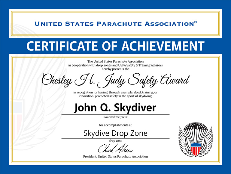 Presenting the Chesley H. Judy Safety Award to someone who “through example, deed, training or innovation, has promoted safe skydiving in a substantive way” is an excellent way to thank a role model at your DZ. The Ches Judy is a completely grass-roots award, and this type of peer-to-peer recognition is particularly meaningful to recipients. All you need to do is choose a USPA member to receive the award, and USPA will mail you a certificate suitable for presentation on Safety Day. Send the name of the recipient, the name of the drop zone and the address to which USPA should mail the certificate to safety@uspa.org by February 20.