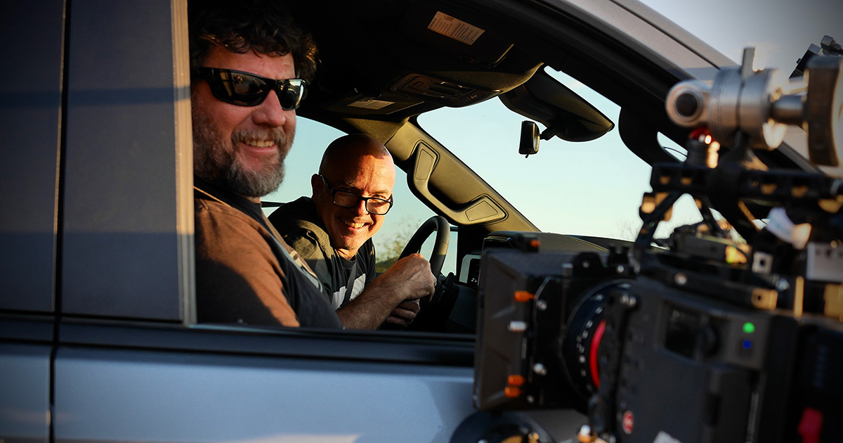 Joe Jennings (driver seat) and Steve Curtis on the set of “Space Cowboy.” Photo courtesy of the filmmakers.