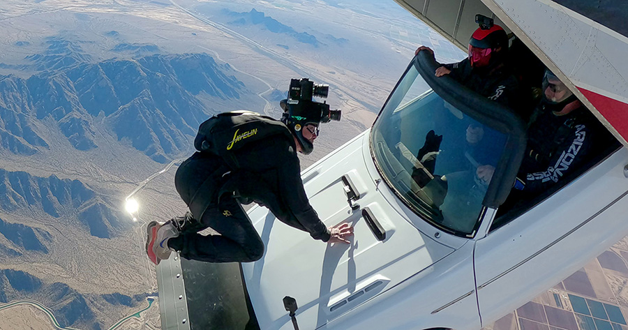 Joe Jennings captures the car exiting the Skyvan over the desert during the documentary’s filming. Photo courtesy of Mark Kirschenbaum/Hypoxic.