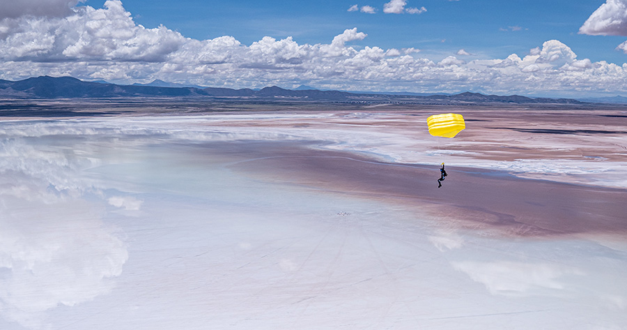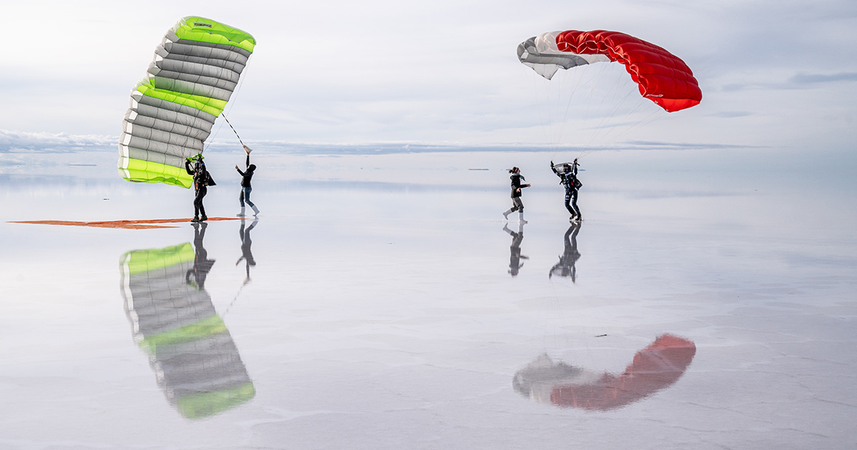 Every jump was different, and the salt flats never looked the same. In the early mornings, incredible hues of amber and peach painted the sky, with the glistening colors reflected over the flats. From hop-and-pops to belly jumps and high pulls, the group put together a variety of skydives, and they actually hoped for rain, which accentuated the ethereal mirror effect.