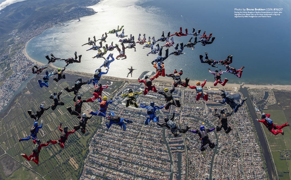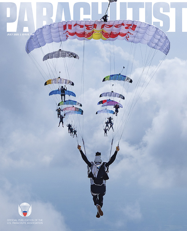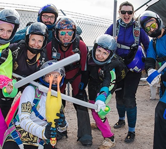 At Skydive Arizona in Eloy, (clockwise from “driver”) Carlo Manuel, Dan Baker, Sam Laliberte and Joel Tremblay perform a car-drop stunt to promote Cleared Hot’s Vet Boogie.