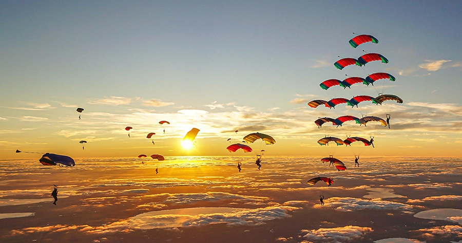 One-hundred-twenty-nine canopy formation jumpers from 16 countries—supported by eight videographers and 10 ground-support personnel—worked on large formations and trained newer CF folks on smaller ones, making a total of 3,055 jumps on 202 loads. Photo by Daniel Lepôt.
