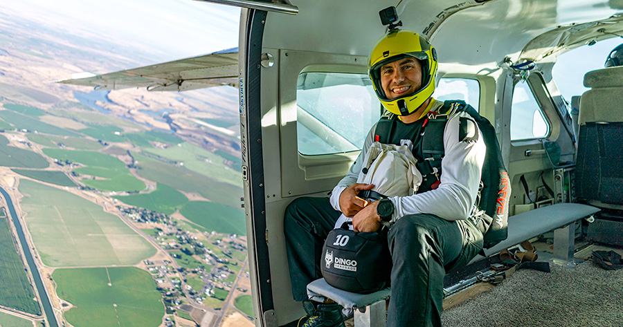 At Skydive Arizona in Eloy, (clockwise from “driver”) Carlo Manuel, Dan Baker, Sam Laliberte and Joel Tremblay perform a car-drop stunt to promote Cleared Hot’s Vet Boogie.