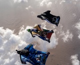 Johann Kruger, Rashid Abdullah and Darren Burke fly their wingsuits at the Skydive Dubai Desert Campus in the United Arab Emirates.