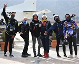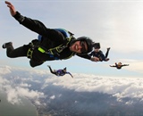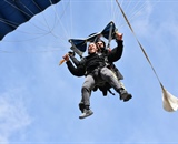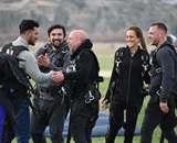 An excited Matt Pinfield (center) celebrates a successful tandem jump with other event participants. Photo by Natalie Mast.