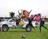 At Skydive Arizona in Eloy, (clockwise from “driver”) Carlo Manuel, Dan Baker, Sam Laliberte and Joel Tremblay perform a car-drop stunt to promote Cleared Hot’s Vet Boogie.