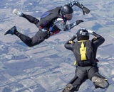Michael Erickson (black and yellow rig) coaches John Kidd Sr. at Skydive Spaceland-Dallas in Whitewright, Texas.