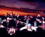 Participants fly a long canopy formation across the horizon during the Operation VK event at Skydive City Zephyrhills in Florida.