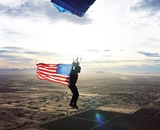 Photo by Niklas Daniel | D-28906 Mike Hall jumps with the American flag while the sun begins to set at SKYDIVE ARIZONA in Eloy.