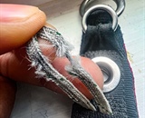 A jumper noticed this severe damage to the three-ring retention loop on his risers when cleaning his cutaway cables. Closer inspection revealed that the grommet that the loop passes through on the riser was not seated completely, leaving a rough edge exposed. This rough piece of metal sawed into the fabric of the loop when it was under load. It is likely that this damage occurred fairly quickly over the previous few months, since the rig owner inspected his gear regularly, including his risers.