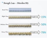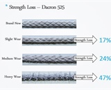 To illustrate how your lines lose strength over time, we took some linesets at various stages of life and submitted them to a series of tensile tests. The results are shown on each photo as a percentage of strength loss. It’s important to note that these lines could have any number of jumps based on the environment and packing area. The “heavy wear” examples could have 200 jumps in a desert or 600-1,000 jumps in a grassy environment with a clean packing area. There is no hard rule about how many jumps a lineset will last. In any case, the heavy-wear samples shown here are well past the point at which they should have been replaced.