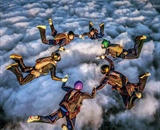 Team 6-Way and Chill (Douglas Hendrix, Nick Jayakar, Stephanie Krar, William Savage, Alex Teskey and Andrew Yin) from the University of Connecticut builds a round during the 6-way formation skydiving event at the USPA National Collegiate Parachuting Championships at Skydive Lake Wales in Florida.