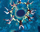 Jumpers fly a round over the Great Blue Hole, a large submarine sinkhole in the Caribbean, during the Boogie in Belize.