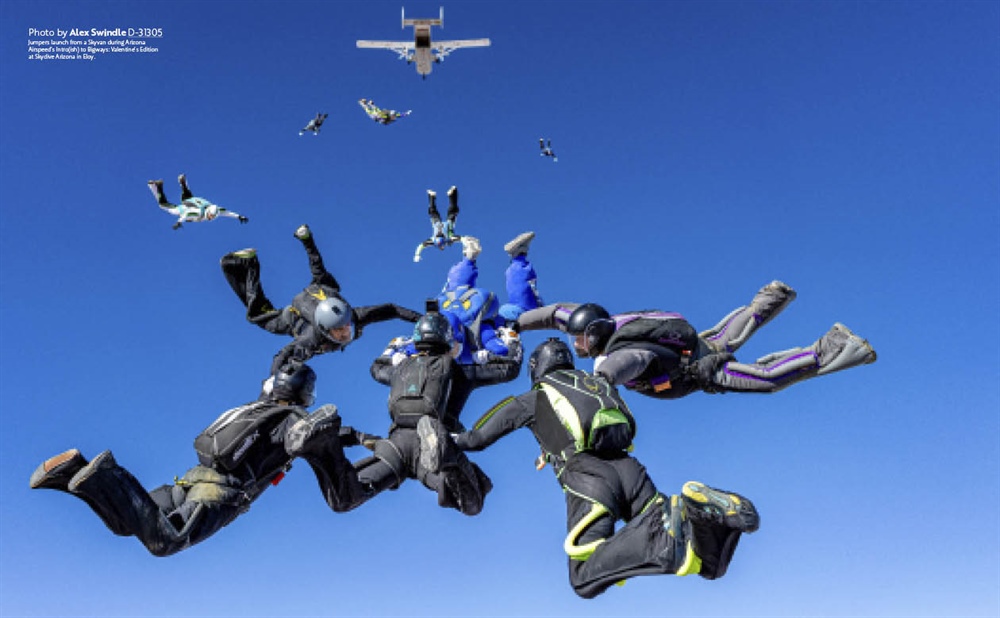 Jumpers launch from a Skyvan during Arizona Airspeed’s Intro(ish) to Bigways: Valentine’s Edition at Skydive Arizona in Eloy.