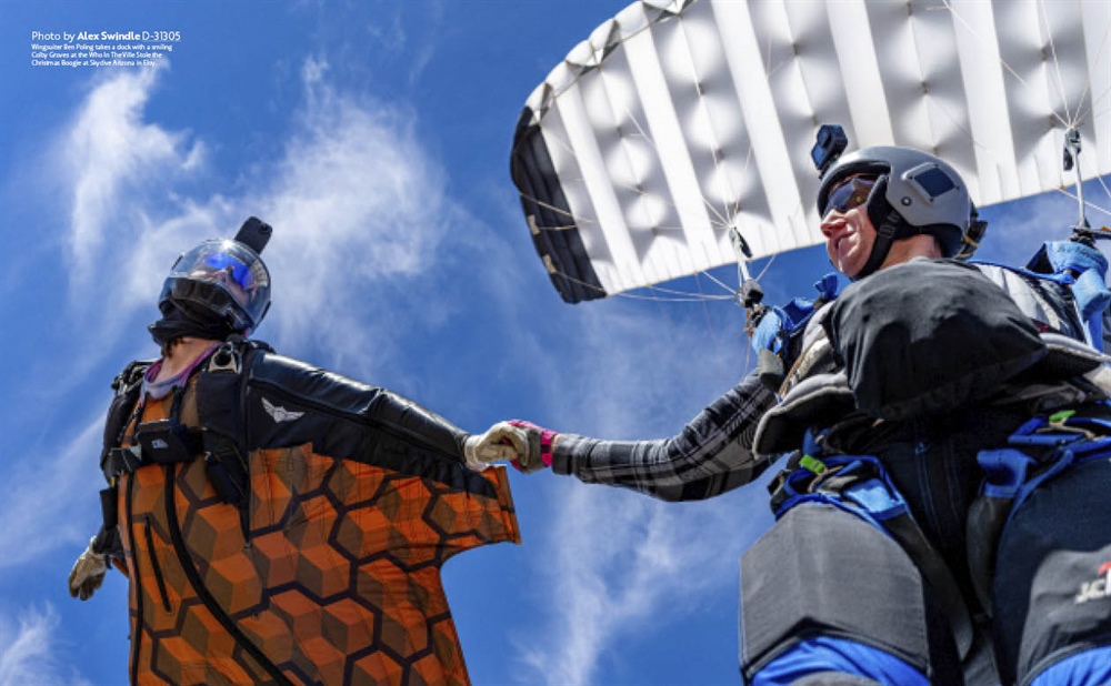 Wingsuiter Ben Poling takes a dock with a smiling Colby Groves at the Who In The Ville Stole the Christmas Boogie at Skydive Arizona in Eloy.