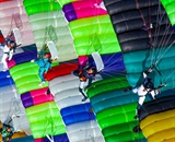 Jumpers with Canopy Formation Specialists make a demonstration skydive into an airshow in Laiwu, China, in September, 2011.