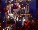 Members of World Team exit a C-130 at 22,000 feet during the Royal Sky Celebrations in Thailand in 1999, where the team set a Fédération Aéronautique Internationale World Record for Largest Formation Skydive with a 282-way.