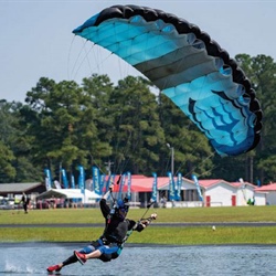 In the second year of speed skydiving as a USPA Nationals event, 15 competitors, including two females, vied to be the fastest freefall skydiver in the U.S. Kyle Lobpries ended the meet with a 484.59 kph average to take the gold. On his way, he put up a 495.4 kph (approximately 307.8 mph) run, setting the North American Continental Record for Fastest Speed Skydive. Brigmon, who had already earned two artistic-event medals with Axiom XP earlier in the competition, decided to try his hand at speed for the first time and took the silver medal with an average of 469.26 kph. Christopher Acevedo from the Golden Knights took the bronze with 463.51 kph.