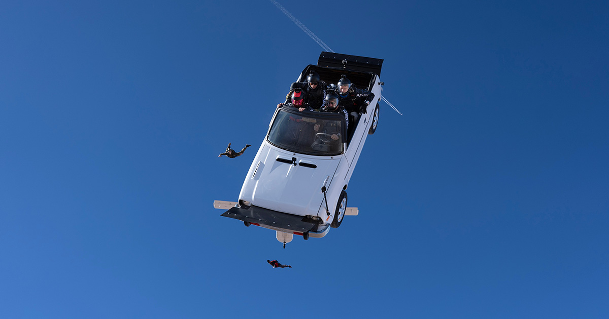 Wingsuiter Ben Poling takes a dock with a smiling Colby Groves at the Who In The Ville Stole the Christmas Boogie at Skydive Arizona in Eloy.