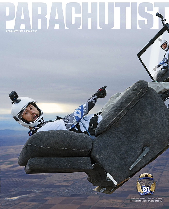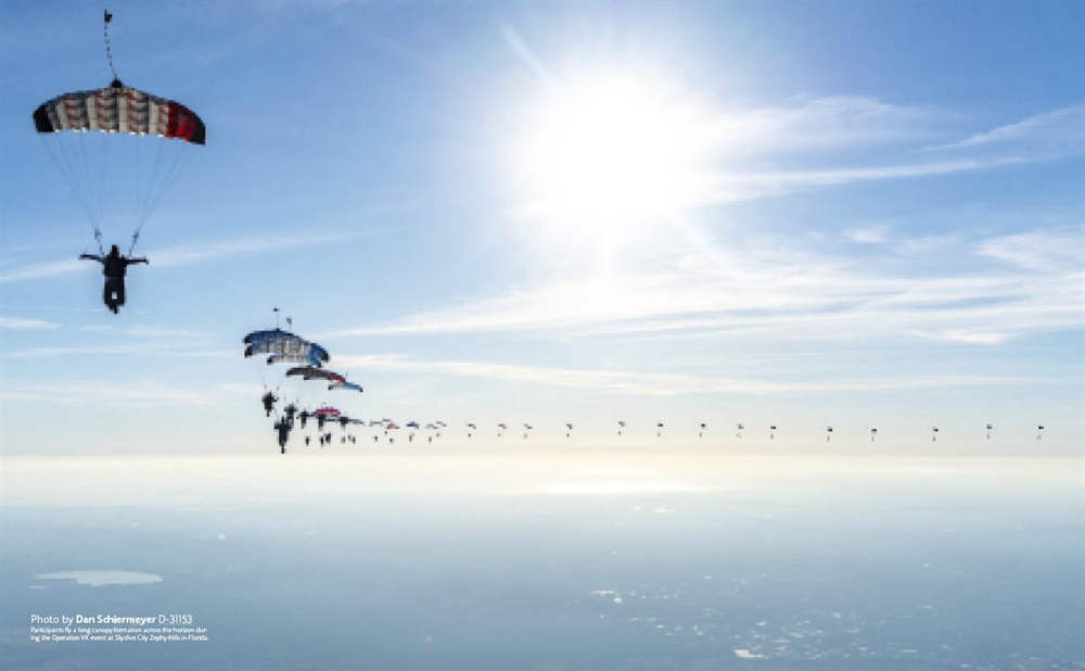 Participants fly a long canopy formation across the horizon during the Operation VK event at Skydive City Zephyrhills in Florida.