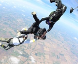 North Central Regional Director and AFF Instructor Examiner Michael Wadkins geeks the camera while evaluating instructor candidates Connor McCauley and Constantin Mircea Moisei during an AFF rating course at Skydive Twin Cities in Baldwin, Wisconsin.