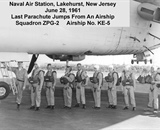 The Navy authorized off-duty parachute jumping in 1959, and instructors at the Navy Parachute Rigger School formed one of the first Navy sport parachute clubs. Knowing the history of blimp jumping at the Lakehurst Air Station, we thought it appropriate to honor the past with one last parachute jump from one of those airships. On June 28, 1961, instead of climbing down a rope ladder from an open gondola, we climbed up a steel ladder to enter a cabin larger than a Greyhound bus. Since I was jumpmaster, and therefore the last out, I can claim the title of the Last Navy Blimp Jumper.