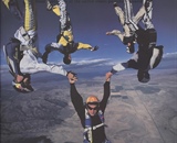Photographer Janine Hill took this photo after Ron Noffz transitioned to an upright position while (left to right) Jon Devore, Kenny Cosrove, John Shoffner and Sven Zimmermann fly head down over Skydive Lake Tahoe in Beckworurth, Califorinia.