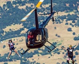 Photo by Iwan van der Schoor | D-29627 Mark and Nancy Lichtle exit a helicopter for a demonstration jump into Lake of the Pines, California, to kick off the community's Fourth of July parade.