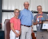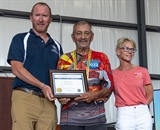Cliff Dobson accepts his 10,000-Jump Wings from USPA Executive Director Albert Berchtold and President Sherry Butcher. Photo by Javier Ortiz.