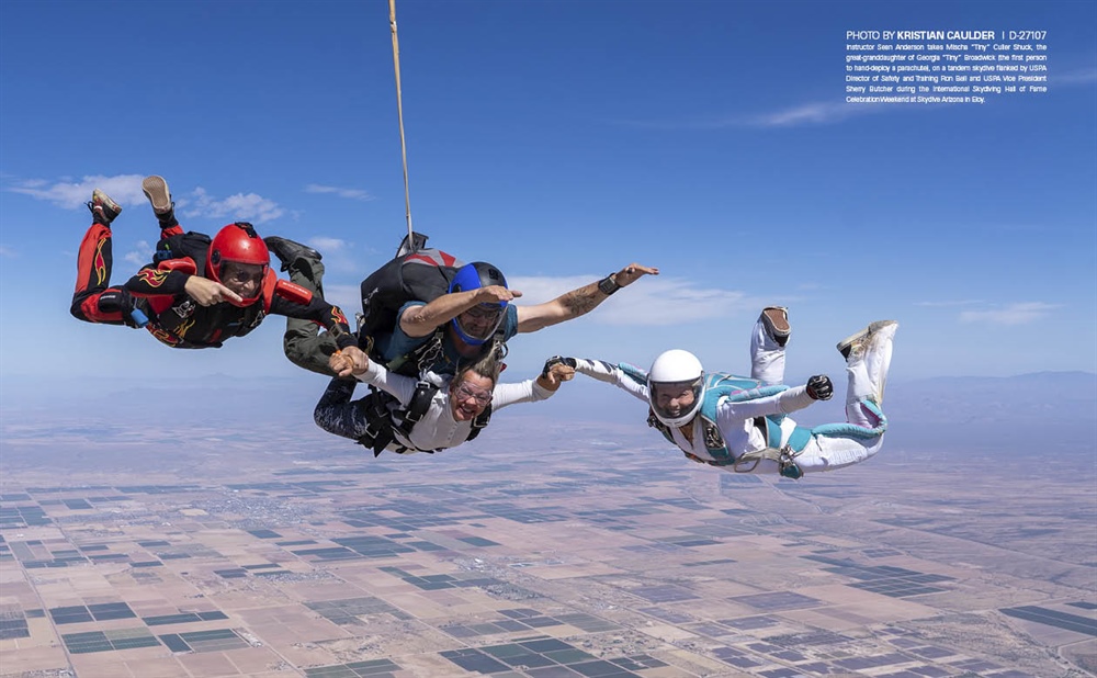 Instructor Sean Anderson takes Mischa “Tiny” Culler Shuck, the great-granddaughter of Georgia “Tiny” Broadwick (the first person to hand-deploy a parachute), on a tandem skydive flanked by USPA Director of Safety and Training Ron Bell and USPA Vice President Sherry Butcher during the International Skydiving Hall of Fame Celebration Weekend at Skydive Arizona in Eloy.