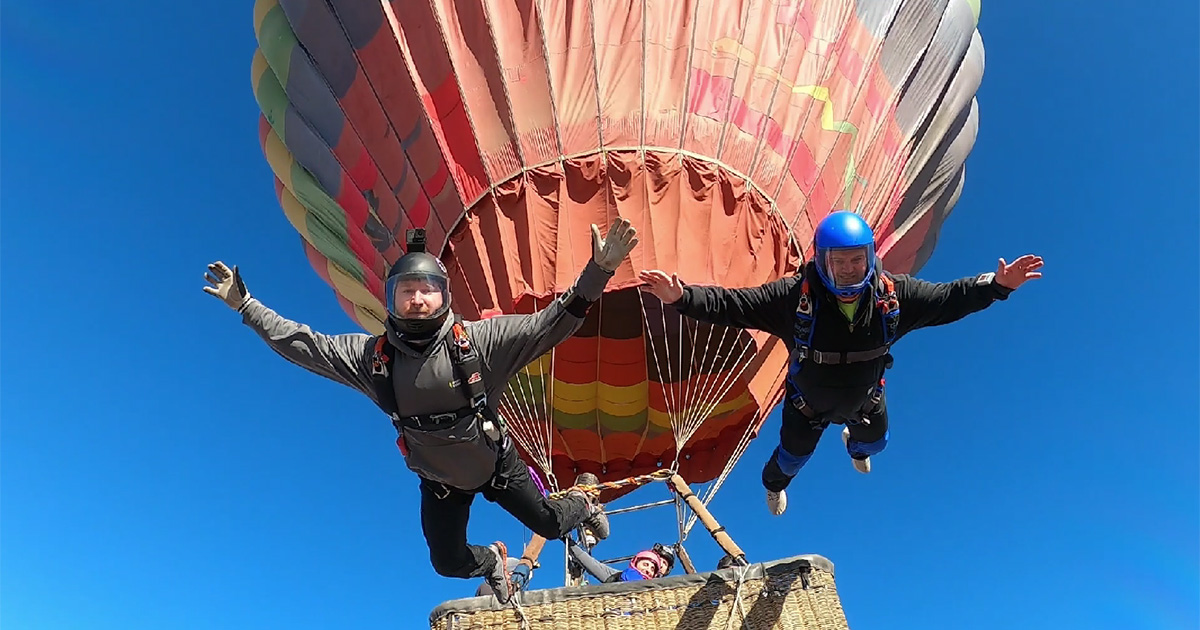 Participants fly a long canopy formation across the horizon during the Operation VK event at Skydive City Zephyrhills in Florida.