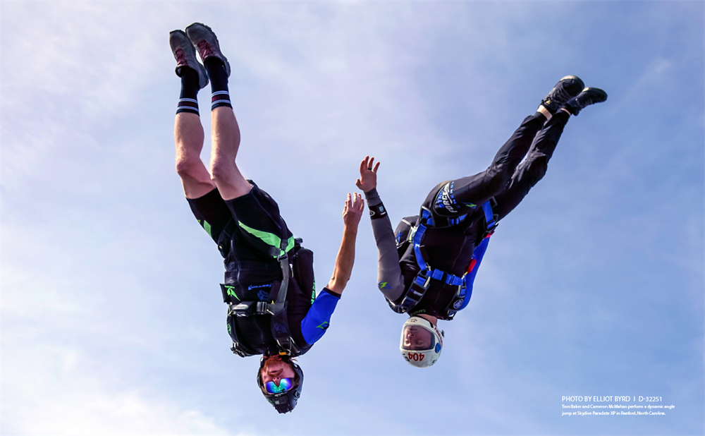 Tom Baker and Cameron McMahan perform a dynamic angle jump at Skydive Paraclete XP in Raeford, North Carolina.