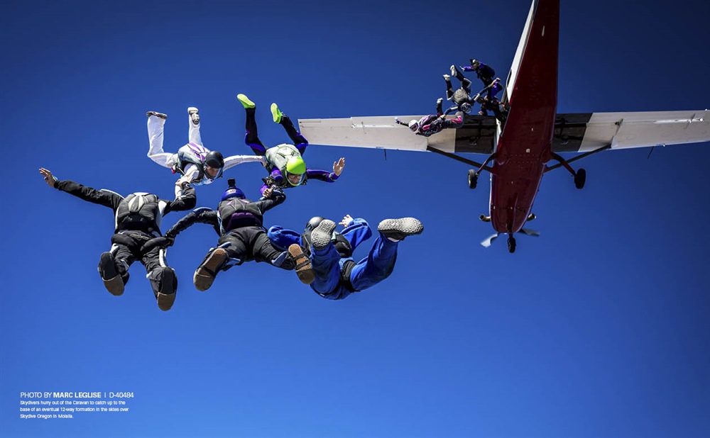 Skydivers hurry out of the airplane to catch up to the base of an eventual 12-way formation in the skies over Skydive Oregon in Molalla.