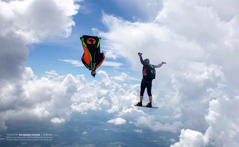 Wingsuit flyer Craig Lambton carves around skysurfer Kyle Batchelor during Shredfest at Cleveland Skydiving Center in Garrettsville, Ohio.