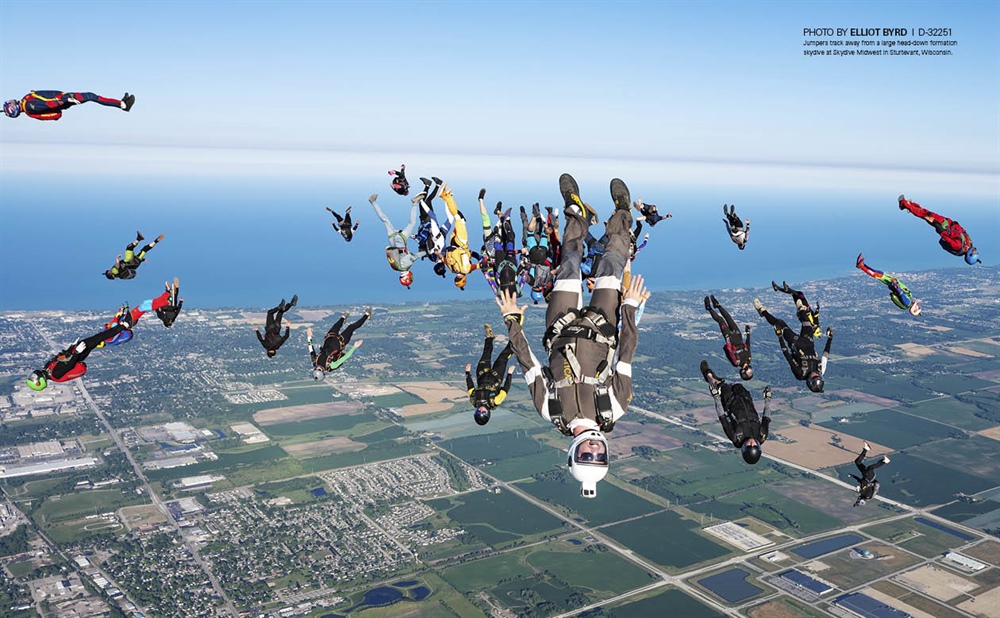 Jumpers track away from a large head-down formation skydive at Skydive Midwest in Sturtevant, Wisconsin.