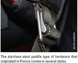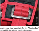 Stainless hardware did present some challenges for a time. Hardware that slipped when loaded became an issue. So along with the use of the new, smoother metal came new designs. The conventional floating-bar hardware works better with some harness and webbing combinations than others. Some rig manufacturers have addressed this problem with an additional layer of webbing. One hardware manufacturer offers a clunky looking spring-loaded design that keeps the floating bar tightly in position. On the two-piece paddle types of hardware that originated in France, it took a few tries for some manufacturers to dial in the configuration and tolerances. But on the whole, stainless-steel hardware has proven to be worth the extra expense—several hundred dollars per system in most cases—both in new and pre-owned equipment. It can greatly extend the useful life of a harness and container system (not to mention keeping dangerous metals from absorbing into our sweaty, acidic skin). If our little cottage industry had started out large enough to afford its own stainless-steel castings from the beginning, it’s likely we’d have never used cadmium-plated hardware at all. Now we don’t have to.