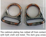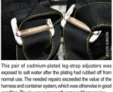 Manufacturing defects notwithstanding, all the hardware on your parachute system will take any load skydiving can deliver. But over time—and not much time in some locations—cadmium plating wears off, especially where the harness straps rub against it or where one metal part contacts another. Humidity mixed with industrial pollution can accelerate the degradation.